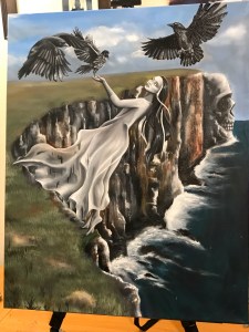 The painting shown is the first painting I finished with this method and it was so nice being able to “experiment” with the dress color and not have to start over every time like I used to have to do.  In this painting “A Murder” only the woman and birds were done in this method but I love the look and depth that was added.  Since I use water-mixable oils I can just add water to thin my paint to the right consistency for glazing but water should not be used for the final layer as water alone is not archival.  I’ve found that modified linseed oil of course works well but lengthens the drying time of the paints so it’s not ideal (oil paints already take long enough to dry).  Woil Water-mixable gel medium works best for me.  It creates a smooth glaze and speeds up drying time.