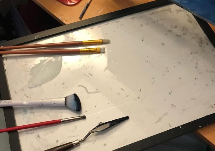 I have found that glass makes the best palette for oil paints. If any paint happens to dry out completely it can be easily cleaned off using a sharp edge like a razor blade and the smooth surface is so nice for mixing paints. I turned a glass 11×14 picture frame into my mixing palette by simply taping the back side of the glass with clear packing tape to prevent shattering and using the frame itself to protect the shape edges of the glass.